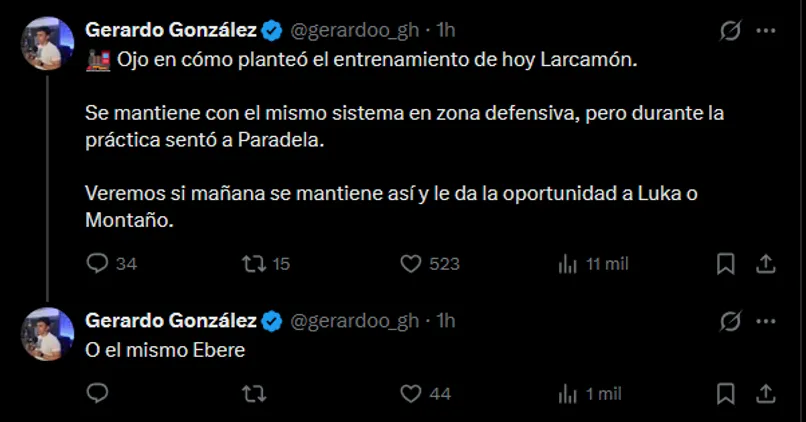 “Ojo en cómo planteó el entrenamiento de hoy Larcamón. Se mantiene con el mismo sistema en zona defensiva, pero durante la práctica sentó a Paradela. Veremos si mañana se mantiene así y le da la oportunidad a Luka (Romero) o Montaño, o el mismo Ebere“, explicó el reportero en su cuenta de X.