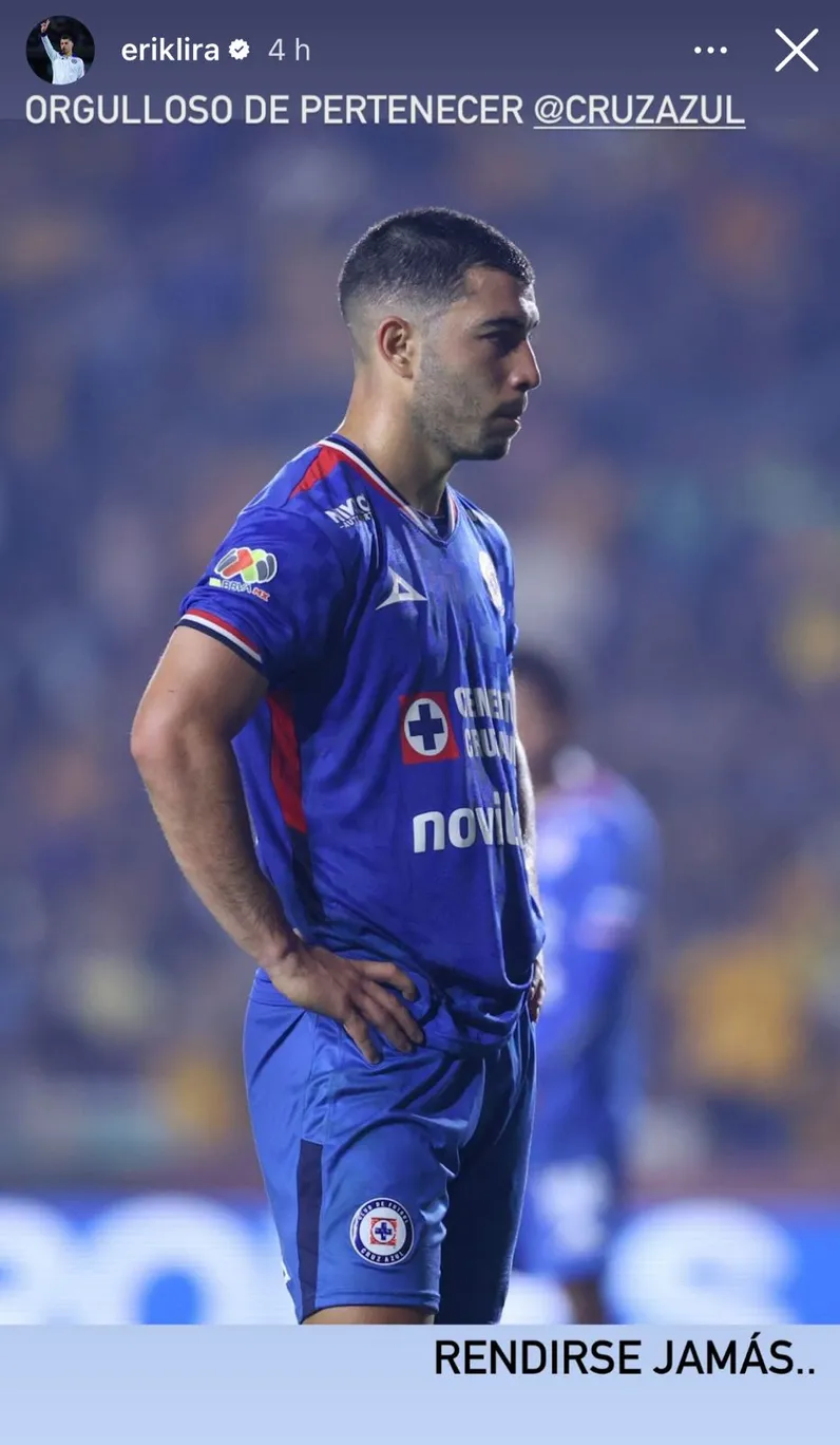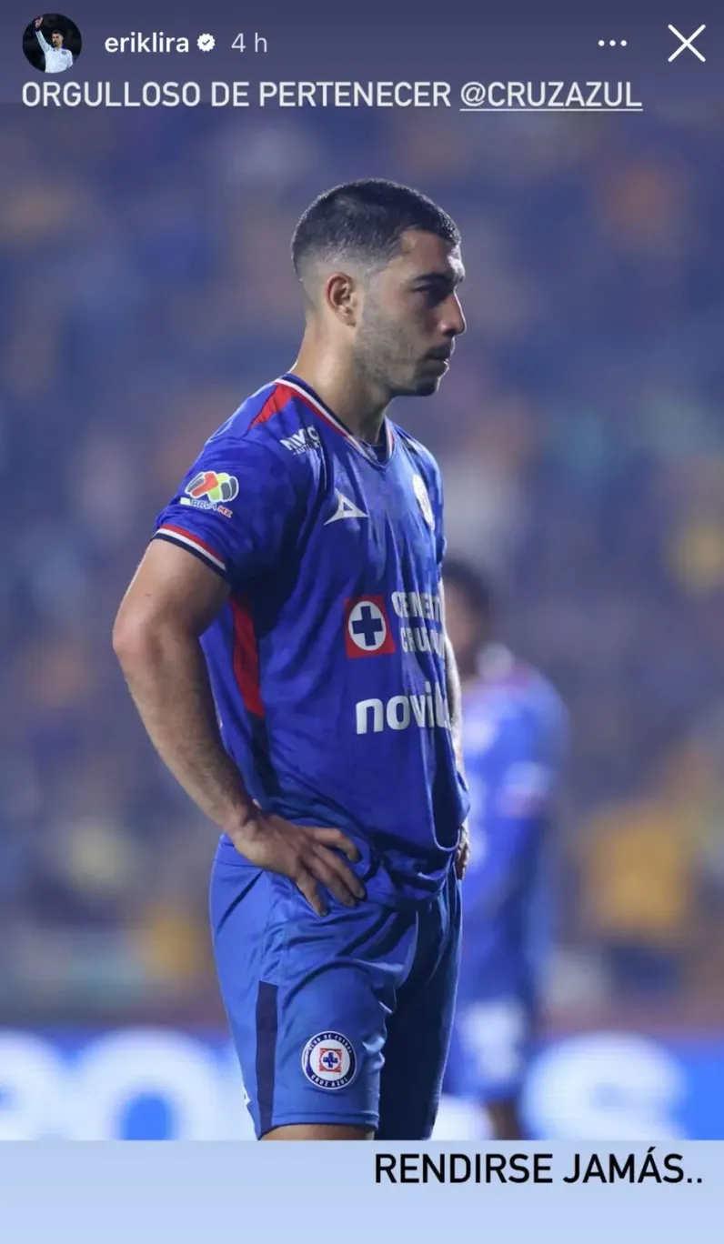 Quien se pronunció a través de las redes sociales en medio de un clima tenso es Erik Lira, uno de los grandes referentes del cementero puertas adentro. En su cuenta personal de Instagram, lanzó un ‘grito de guerra’ buscando motivar a los aficionados y propios compañeros: “Orgulloso de pertenecer a Cruz Azul, rendirse jamás“.