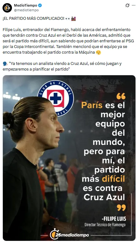 La declaración de Filipe Luis refleja un doble reconocimiento. Por un lado, coloca el duelo contra Cruz Azul en el mismo plano de riesgo que enfrentar al PSG; por otro, demuestra que el respeto no nace del discurso, sino de la preparación. “Ya tenemos un analista observando a Cruz Azul, así que ya sé cómo juegan y empezaremos a planificar el partido”, añadió, dejando claro que el estudio del rival ya comenzó.