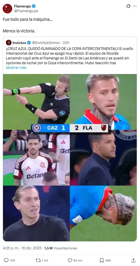 El último post fue quizá el más contundente. “Fue todo para la máquina… menos la victoria”, escribieron en la cuenta Flamengo, cerrando el episodio con un mensaje que remarcaba lo evidente: Cruz Azul se iba eliminado, sin premio y sin respuesta dentro del campo. Ese mensaje fue leído como una burla que cruzaba la línea deportiva. Para otros, un recordatorio del momento complicado que atraviesa el club tras un semestre sin títulos.