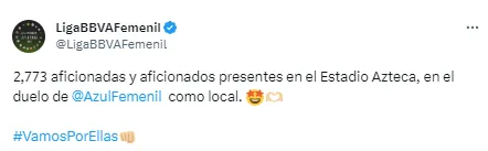 La Liga MX confirmó que fueron apenas 2,773 los aficionados que se dieron cita en el Estadio Azteca para el partido de Cruz Azul ante las Rayadas, este sábado al mediodía.