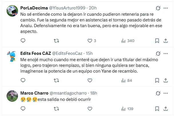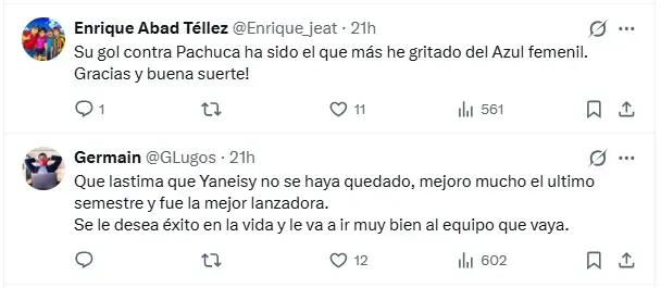 Uno de los comentarios más sentidos recordó su aporte en la Liguilla: “Su gol contra Pachuca ha sido el que más he gritado del Azul femenil. Gracias y buena suerte”, escribió un seguidor. Otros, pusieron el foco en su evolución y en lo que aún podía aportar al proyecto: “Qué lástima que Yaneisy no se haya quedado, mejoró mucho el último semestre y fue la mejor lanzadora”.