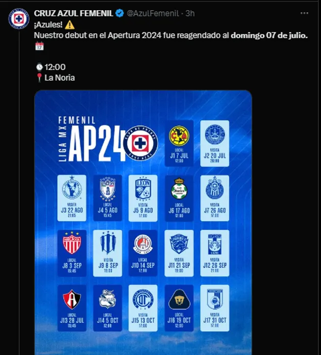 Acompañado de una imagen del escudo de la institución, la fecha fue reagendada para el domingo 7 de julio, encuentro que se disputará a las 12 horas de México en la Noria ante elAmérica. Sí, el mismo día veremos en acción a hombres y mujeres, algo que no suele suceder muy a menudo.
