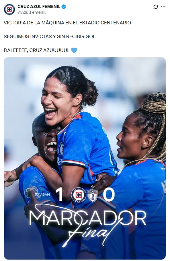 Con esta victoria, Cruz Azul Femenil llegó a siete puntos de nueve posibles y se mantiene invicto tras tres jornadas, sin recibir goles. El equipo ha enfrentado de manera consecutiva a dos de las escuadras más fuertes del torneo (Chivas y Pachuca) y salió fortalecido, con un empate y una victoria que respaldan el trabajo realizado.