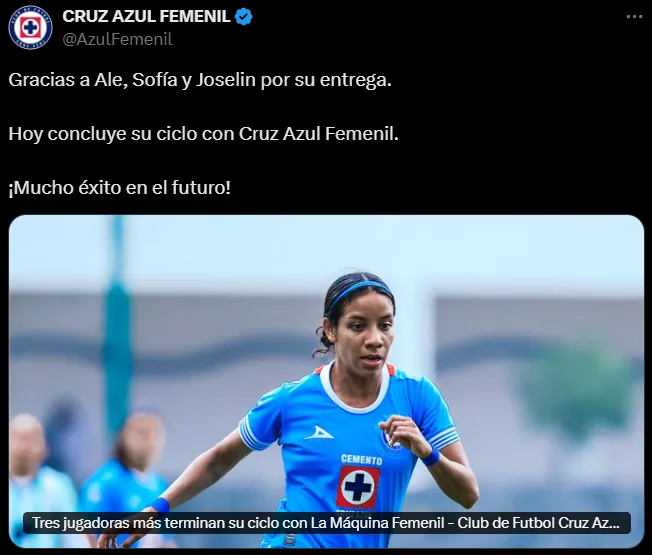 En un comunicado conjunto, Cruz Azul Femenil también le dio las gracias a Alejandra Martínez, Sofía Ramondegui y Joselin Muñoz. La salida más significativa es la de Alejandra, ex Rayadas y dos veces campeona de la Liga MX Femenil que llegó para el Clausura 2023 y jugó 53 partidos.