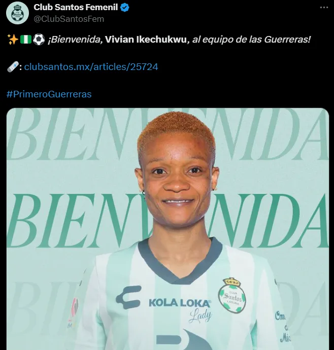A través de sus redes sociales, Santos Laguna presentó a Ikechukwu como fichaje para el Torneo Clausura 2025. De esta manera, la delantera se marcha de la institución de La Noria apenas un semestre después, tras no conseguir el objetivo de acceder a la Liguilla.