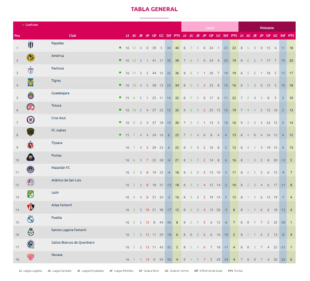 Así está la TABLA DE POSICIONES de Liga MX Femenil