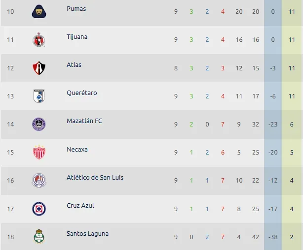 De esta manera, es que Cruz Azul se ubica a un solo lugar del fondo de la Tabla de Posiciones. Hasta el momento, y después de las primeras nueve jornadas disputas, tan solo registra cuatro puntos y una diferencia de -17 goles.