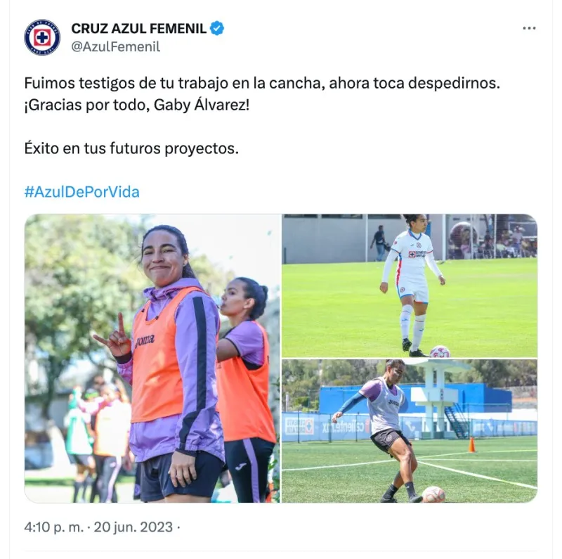 “Fuimos testigos de tu trabajo en la cancha, ahora toca despedirnos. ¡Gracias por todo, Gaby Álvarez! Éxito en tus futuros proyectos”, apuntó Cruz Azul Femenil en la publicación en sus redes sociales, donde anunció la salida de la defensa mexicana.
