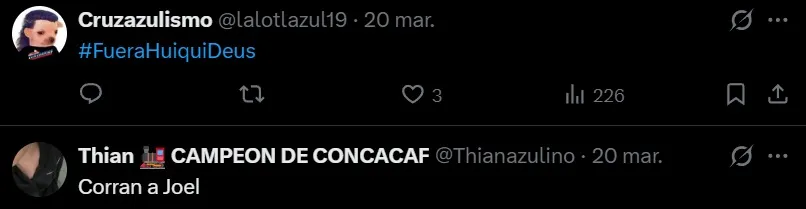 Ante este resultado y presente indeseado para el equipo cementero (el cual también es una realidad en otras categorías), aficionados se expresaron a través de las redes sociales, y muchos de ellos no dudaron en pedir la salida de Joel Huiqui.