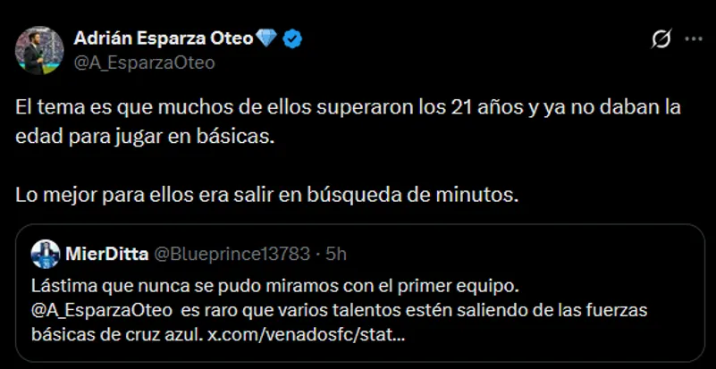 Uno de sus seguidores le expresó: “Es raro que varios talentos estén saliendo de las fuerzas básicas de Cruz Azul, y el hombre de TUDN fue claro. “El tema es que muchos de ellos superaron los 21 años y ya no daban la edad para jugar en básicas. Lo mejor para ellos era salir en búsqueda de minutos”.