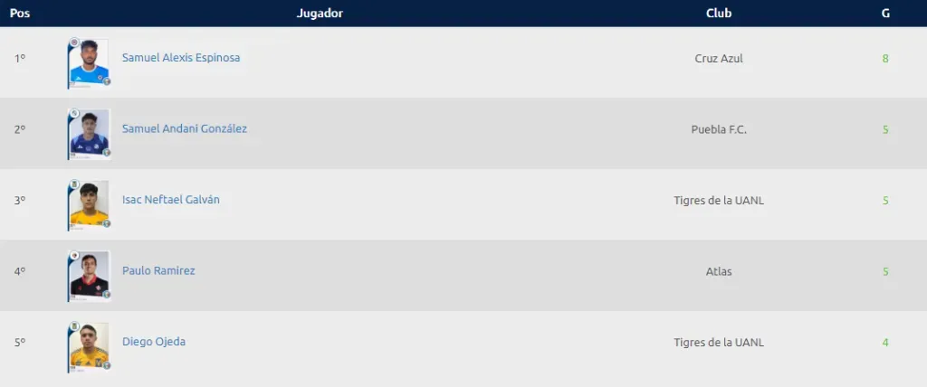 La buena noticia para Samuel Espinosa es que, debido a la amplia ventaja que ya tenía sobre sus más cercanos perseguidores, no perdió el liderato de goleo. Así, se mantiene en la cima con ocho anotaciones, todas ellas anotadas en un total de cuatro dobletes.