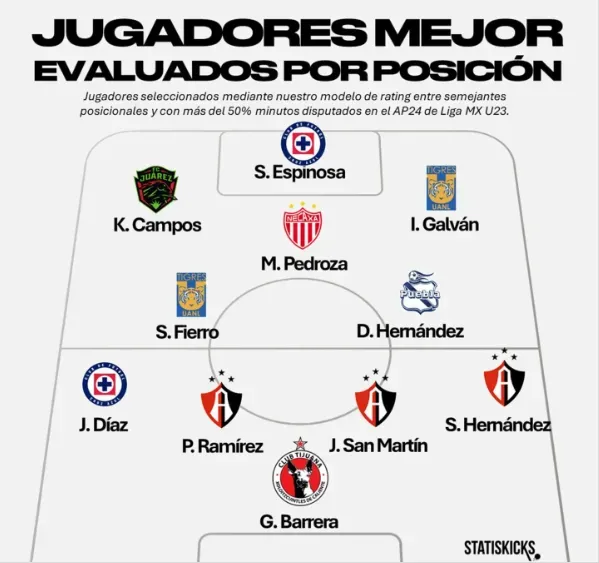 “Jugadores seleccionados mediante nuestro modelo de rating entre semejantes posicionales y con más del 50% minutos disputados en el Apertura 2024 de la Liga MX Sub 23″, explicó Statiskicks acerca de cómo eligió a los 11 mejores elementos de toda la Liga MX.