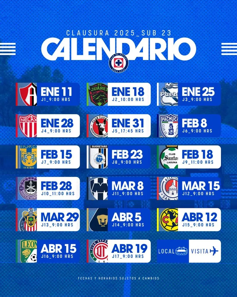 Fue este sábado cuando Cruz Azul destapó el calendario completo de la categoría juvenil para el Clausura 2025. Así dejó ver que enfrentará a los mismos rivales que el primer equipo en la Sub 23 en las mismas fechas, solo con horas antes de diferencia.