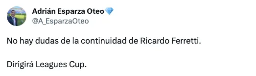 Sin embargo, en Cruz Azul no hay debate con respecto al futuro de Ferretti. Y es que según informa el periodista Adrián Esparza Oteo a través de su cuenta de Twitter, el Tuca seguirá en el banquillo.