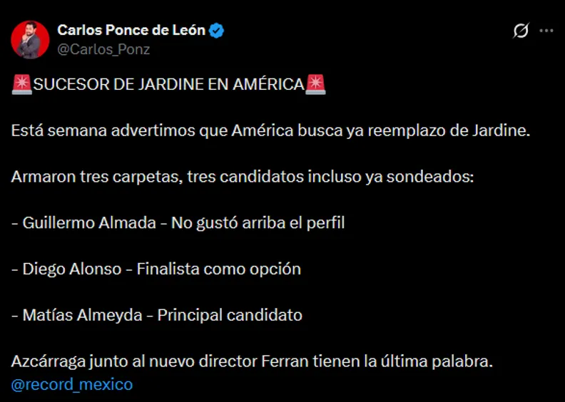 Tras el histórico tricampeonato, el crédito de André Jardine en el América parece haberse agotado por los resultados irregulares. La directiva azulcrema ya busca un reemplazo de jerarquía y, según Carlos Ponce de León de RÉCORD, el nombre de Matías Almeyda es el principal candidato para asumir el mando en Coapa.