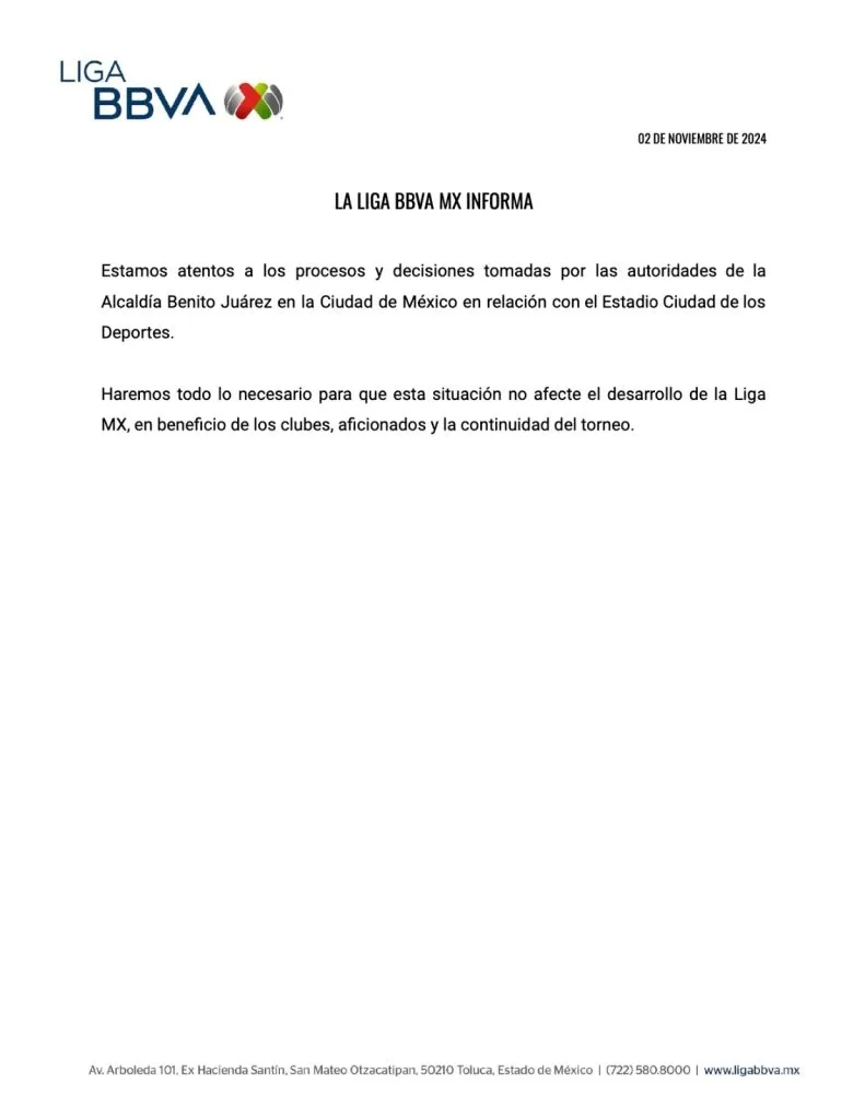 Apenas finalizó el choque entre Cruz Azul y Santos Laguna, la Liga MX publicó un comunicado para referirse a este incidente: “Estamos atentos a los procesos y decisiones tomadas por las autoridades de la Alcaldía Benito Juárez en la Ciudad de México en relación al Estadio Ciudad de los Deportes”, inició el mensaje.
