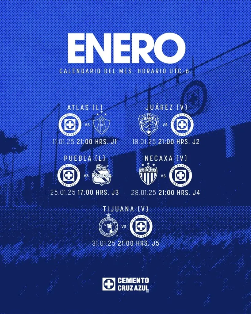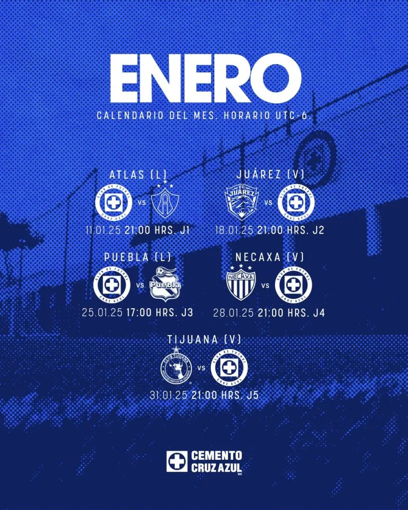 Además, Cruz Azul jugará contra Necaxa el 28 de enero a las 21:00 horas en la Jornada 4, en lo que será la primera fecha doble del Clausura 2025. Finalmente, cerrará el mes enfrentando a Tijuana en la Jornada 5, el viernes 31 de enero a las 21:00 horas, en la semana más intensa del mes.