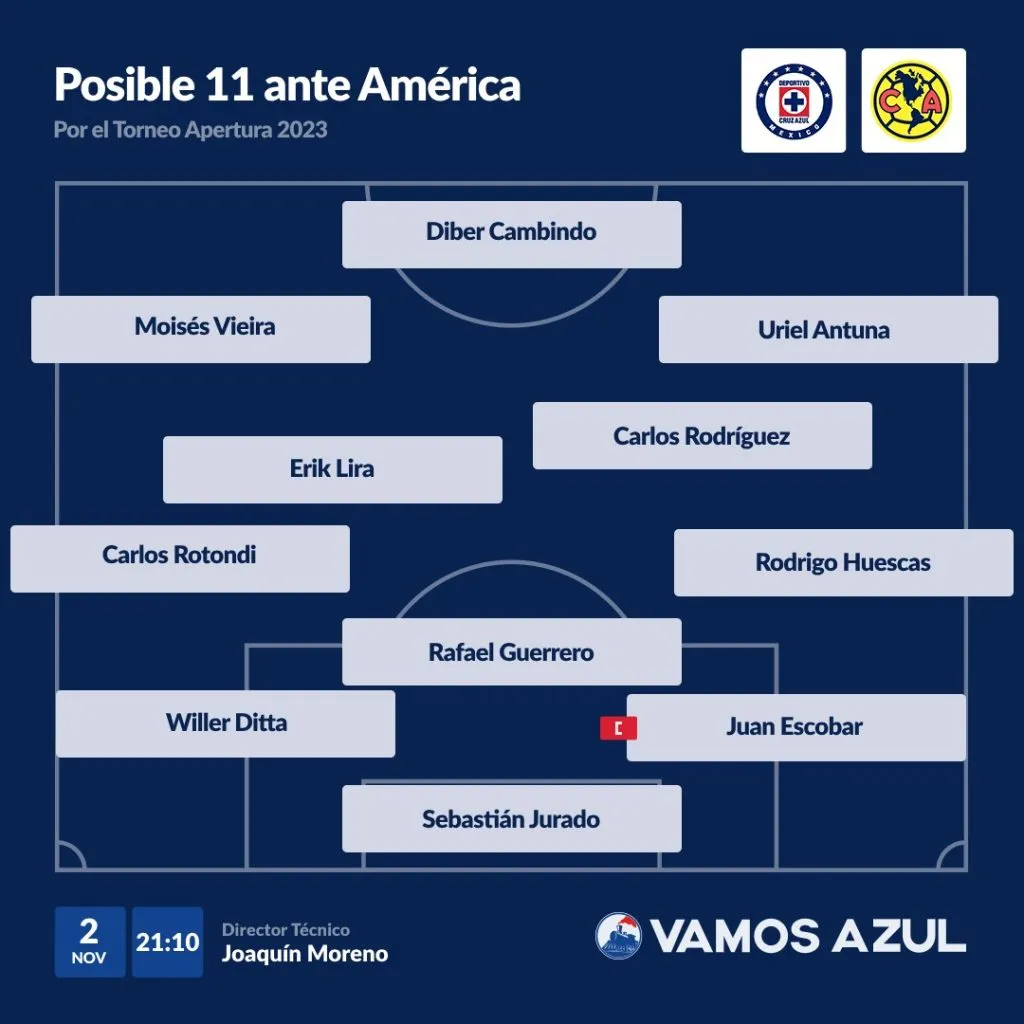 Teniendo en cuenta la pasada jornada y la posible baja de Salcedo, esta podría ser la alineación de Cruz Azul ante América: Sebastián Jurado; Rodrigo Huescas, Juan Escobar, Willer Ditta, Rafael Guerrero, Carlos Rotondi; Carlos Rodríguez, Erik Lira; Uriel Antuna, Moisés Vieira, Diber Cambindo.
