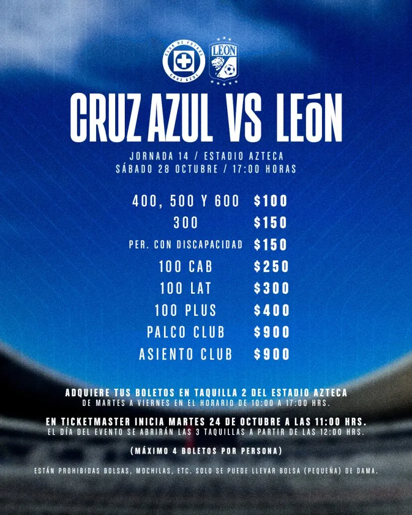 Los boletos para el duelo de Cruz Azul ante León ya están disponibles a través de Ticketmaster y también en la taquilla 2 del Estadio Azteca, en un horario de 10:00 a 17:00 horas, hasta este viernes. Mientras que el día del partido también habrá venta de entradas en las tres taquillas, a partir de las 12:00 horas.