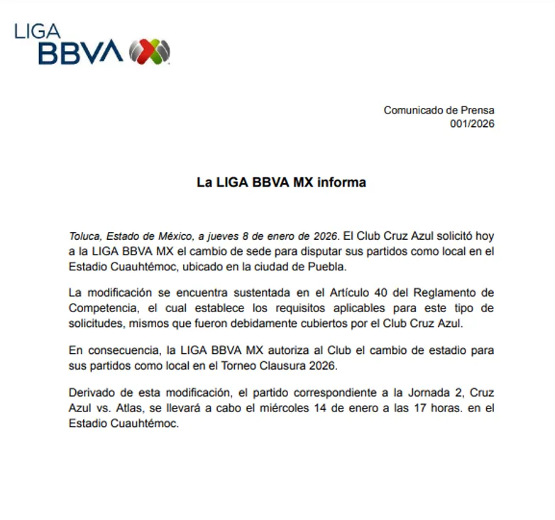 “La modificación se encuentra sustentada en el Artículo 40 del Reglamento de Competencia, el cual establece los requisitos aplicables para este tipo de solicitudes, mismos que fueron debidamente cubiertos por el Club Cruz Azul. En consecuencia, la LIGA BBVA MX autoriza al Club el cambio de estadio para sus partidos como local en el Torneo Clausura 2026″.