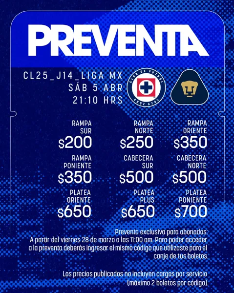 Según la página oficial del club celeste, los boletos saldrán a la venta este viernes 28 de marzo a partir de las 11:00 (hora local) para los usuarios del Pase Azul. Los precios oscilan entre los 200 pesos la entrada más económica y 700 pesos para la más costosa.