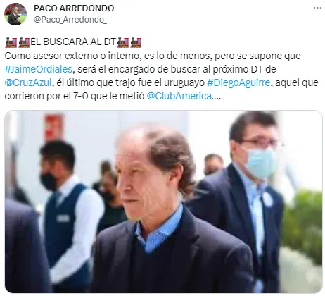 El periodista miembro de TUDN, Paco Arredondo, coincidió en que Jaime Ordiales será el encargado de designar al próximo estratega. Aunque lo hizo con un claro recado: “Se supone que Jaime Ordiales será el encargado de buscar al próximo DT de Cruz Azul, el último que trajo fue el uruguayo Diego Aguirre, aquel que corrieron por el 7-0 que le metió Club America“.