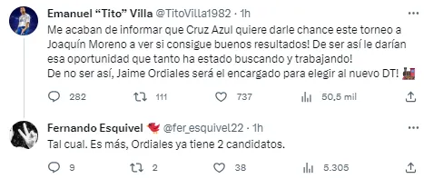 Como respuesta a la publicación de “Tito”, el periodista especializado en mercado de pases, Fernando Esquivel, reveló que Ordiales ya tendría a dos entrenadores apuntados. “Tal cual. Es más, Ordiales ya tiene 2 candidatos”, le escribió.