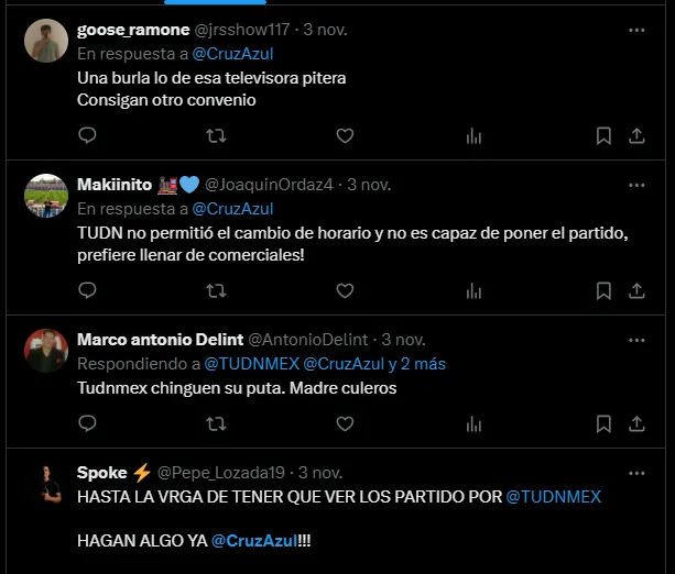 Este contratiempo provocó la bronca de muchos aficionados, los cuales expresaron su malestar en las redes sociales criticando el servicio de TUDN y pidiendo por nuevos acuerdos televisivos. Además de fallar en el cumplimento de la hora establecida, la cadena tampoco fue capaz de aceptar un cambio de horario, algo que incrementó todavía más la bronca de los fanáticos cementeros.