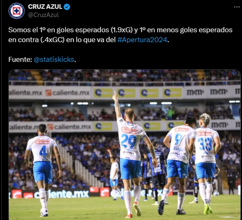 Resulta que Cruz Azul está primero entre los equipos con más goles esperados, y también lidera la tabla de menos goles esperados. “Calidad ofensiva y defensiva“, puso Statiskicks en su cuenta de X, algo que el CM del cementero replicó con orgullo. La misma dicta que en ofensiva da 1.9, mientras que en la zaga solo es 0.4.