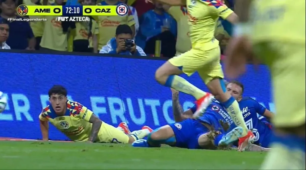 Aunque el jugador de la Máquina se lanza de manera imprudente, parece hacer contacto con el césped y no con el pie de Reyes. El jugador del América apoya su pie en el suelo y allí lo deja para empezar a dejarse caer buscando él mismo el contacto con Rotondi.