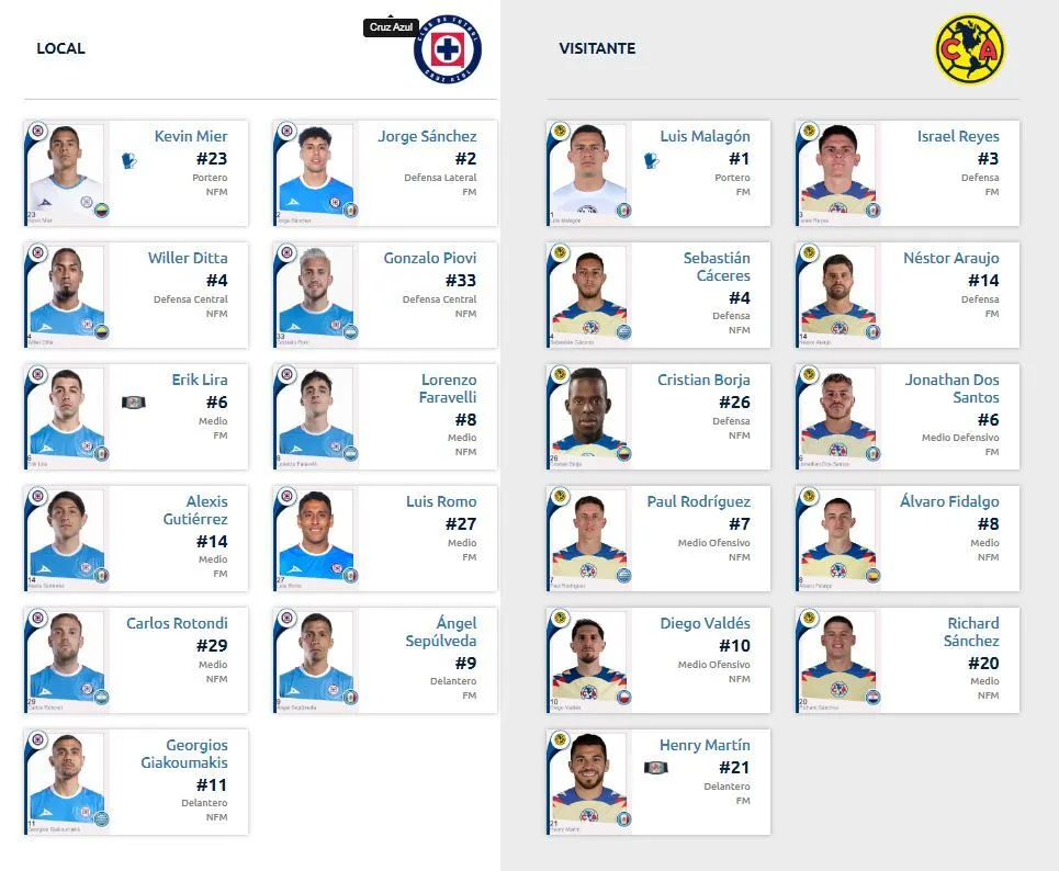Alineaciones de Cruz Azul y América. (Liga MX Oficial)