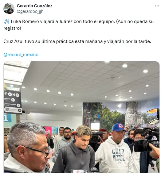 Así lo dio a conocer Gerardo González, periodista de Récord, quien anticipó que la decisión en Cruz Azul con Luka Romero es que se sume al plantel que viajará este viernes rumbo a Juárez. Esto, a pesar de que hasta este momento todavía no se encuentra listo su registro en la Liga MX.
