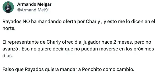 El periodista Armando Melgar sostiene que Monterrey no presentó ninguna propuesta por Charly y que todo habría sido una jugada de su representante, quien lo ofreció hace dos meses sin éxito.