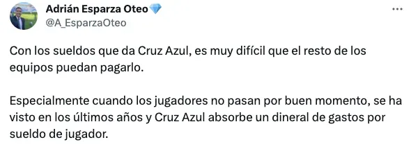 De acuerdo con el periodista Adrián Esparza Oteo, los problemas de Cruz Azul responden a los altos salarios de su plantilla, por lo que ningún equipo quiere asumir el costo de las fichas.