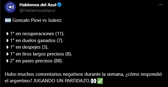 Las estadísticas confirman el buen partido que jugó el fichaje cementero, pues Piovi completó los 90 minutos y en ese tiempo, realizó tres despejes, dos entradas, 88 pases correctos, ocho balones largos siete duelos ganados y hasta tres remates desde tiros de esquina en los que no pudo encontrar portería. En redes sociales, varios aficionados destacaron la mejora en el rendimiento del zaguero zurdo.