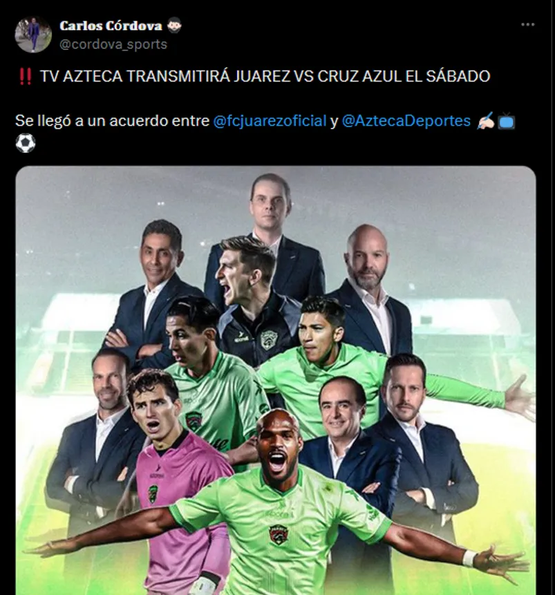 El reportero Carlos Córdova reveló en su cuenta personal de X (ex Twitter) que Cruz Azul y FC Juárez finalmente podrá observarse por TV Azteca. Pese a que se especuló con la señal de Fox Sports y las redes, la directiva del conjunto verde llegó a un acuerdo con dicha televisora. Final feliz para esta historia que pintaba mal.