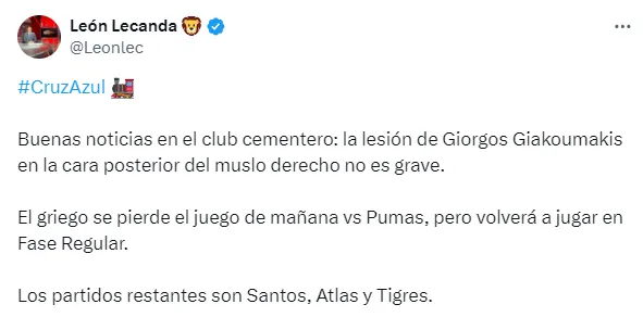 “Buenas noticias en el club cementero: la lesión de Giorgos Giakoumakis en la cara posterior del muslo derecho no es grave. El griego se pierde el juego de mañana vs Pumas”, reveló León Lecanda, periodista de ESPN, acerca de la situación del goleador cementero.