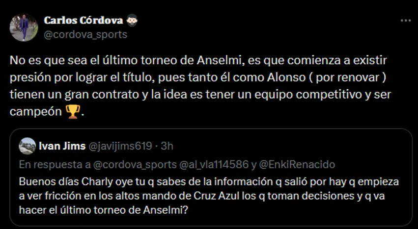 El reportero fue consultado en la red social X por un aficionado cementero, justamente haciendo alusión a su posible salida a mediados del 2025: “No es que este sea el último torneo de Anselmi“, aclaró de entrada la fuente citada. Luego de ello, dejó clara la postura de Víctor Velázquez pese a no haberlo nombrado.