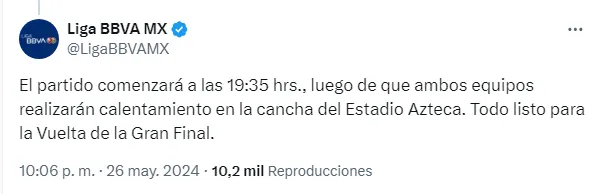 Tras aquel comunicado inicial, la Liga MX confirmó cuál será el horario de inicio: “El partido comenzará a las 19:35 hrs., luego de que ambos equipos realizarán calentamiento en la cancha del Estadio Azteca. Todo listo para la Vuelta de la Gran Final”.