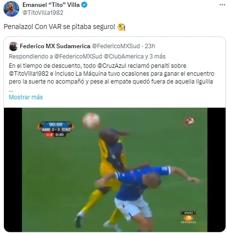 A través de su red social X, Tito Villa recogió un video de aquella polémica jugada y ratificó lo que todos en Cruz Azul pensaban: “¡Penalazo!”. Pero no quedó ahí, pues el exfutbolista Celeste añadió que “con VAR se pitaba seguro”.