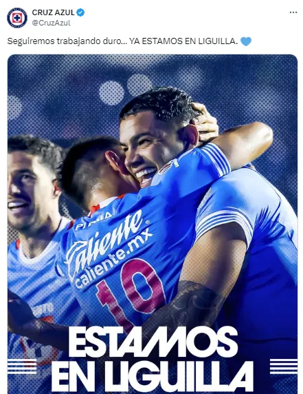 “Seguiremos trabajando duro… YA ESTAMOS EN LIGUILLA”, fue la promesa que lanzó Cruz Azul a su afición, acompañada de una postal en la que se ve a Charly Rodríguez abrazar a Gabriel Fernández y de fondo el capitán Ignacio Rivero sonriendo