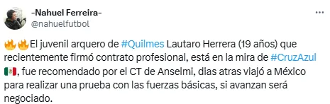 “El juvenil arquero de Quilmes Lautaro Herrera (19 años) que recientemente firmó contrato profesional, está en la mira de Cruz Azul, fue recomendado por el CT de Anselmi, días atrás viajó a México para realizar una prueba con las fuerzas básicas, si avanzan será negociado”, informó el reconocido periodista.