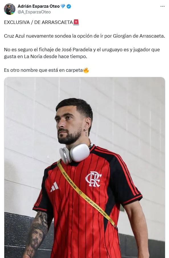En medio de este contexto, Iván Alonso había advertido que Paradela no era el único volante ofensivo que tenía el club en carpeta. Ante esto, Adrián Esparza Oteo reveló el nombre del futbolista en cuestión: Giorgian de Arrascaeta. “No es seguro el fichaje de José Paradela y el uruguayo es un jugador que gusta en La Noria desde hace tiempo”, mencionó el periodista en sus redes sociales.