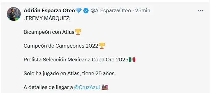 La figura del Atlas, Jeremy Márquez, estaría a detalles de convertirse en nuevo jugador de Cruz Azul. Así lo reveló el periodista Adrián Esparza Oteo en su cuenta oficial de X, donde aseguró que “en los próximos días se puede cerrar” el fichaje del mediocampista de 25 años. “Es muy probable que así sea”, sentenció.