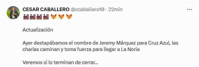 César Caballero también sumó información clave al respecto. En su cuenta de X (ex Twitter), el periodista de ESPN actualizó la situación diciendo: “Las charlas caminan y toma fuerza para llegar a La Noria”. El mensaje fue claro: Cruz Azul está cada vez más cerca de cerrar a uno de los volantes más interesantes del fútbol mexicano.