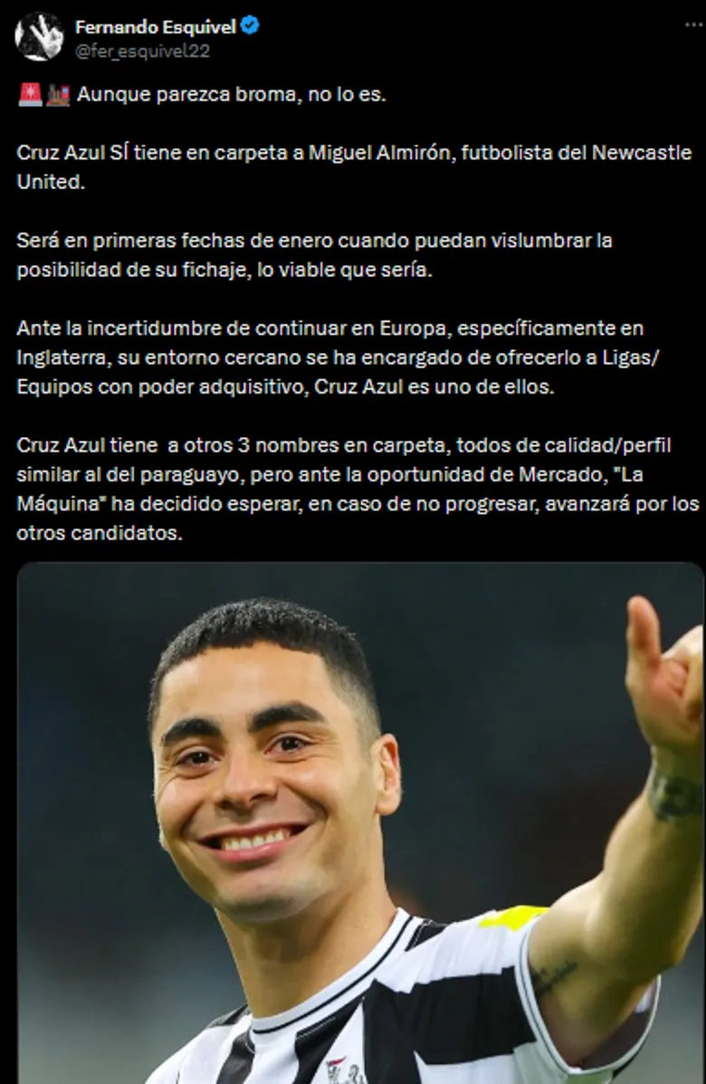 Por otro lado, el periodista Fernando Esquivel dio una noticia que parece especial por el Día de los Inocentes en este 28 de diciembre, aunque se encargó de aclarar que todo es real. Según su información, Cruz Azul sigue atentamente los movimientos de Miguel Almirón, uno de los referentes que tiene Newcastle en la Premier League.