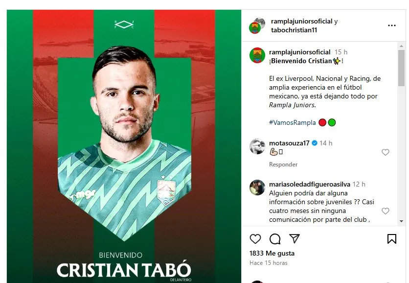 En sus redes sociales, Christian Tabó confirmó su fichaje por Rampla Juniors, equipo de la segunda división del futbol uruguayo. Teniendo en cuenta que la temporada todavía no inició, es una incógnita si su equipo tiene realmente el poder de pelear con Rentistas y Atenas por el ascenso. Lo que sí está claro es que se trata de un destino insólito para un elemento que hace tres años fue fichado por Cruz Azul a cambio de una millonada.