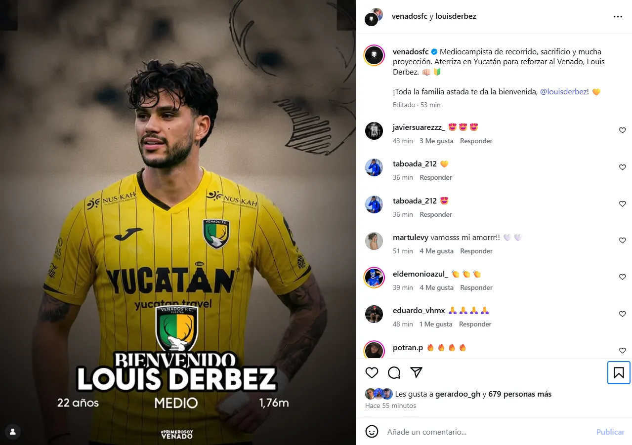 Desde su flamante club le dieron la bienvenida con un mensaje en sus redes sociales: “Mediocampista de recorrido, sacrificio y mucha proyección. Aterriza en Yucatán para reforzar al Venado, Louis Derbez. ¡Toda la familia astada te da la bienvenida!”
