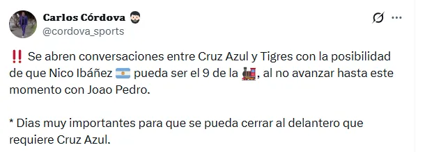 El ex jefe de prensa de Cruz Azul, Carlos Córdova, también aportó claridad desde sus redes sociales al confirmar contactos formales entre las directivas. “Se abren conversaciones entre Cruz Azul y Tigres con la posibilidad de que Nico Ibáñez pueda ser el 9 de La Máquina, al no avanzar hasta este momento con Joao Pedro. Días muy importantes para que se pueda cerrar al delantero que requiere Cruz Azul”, publicó.
